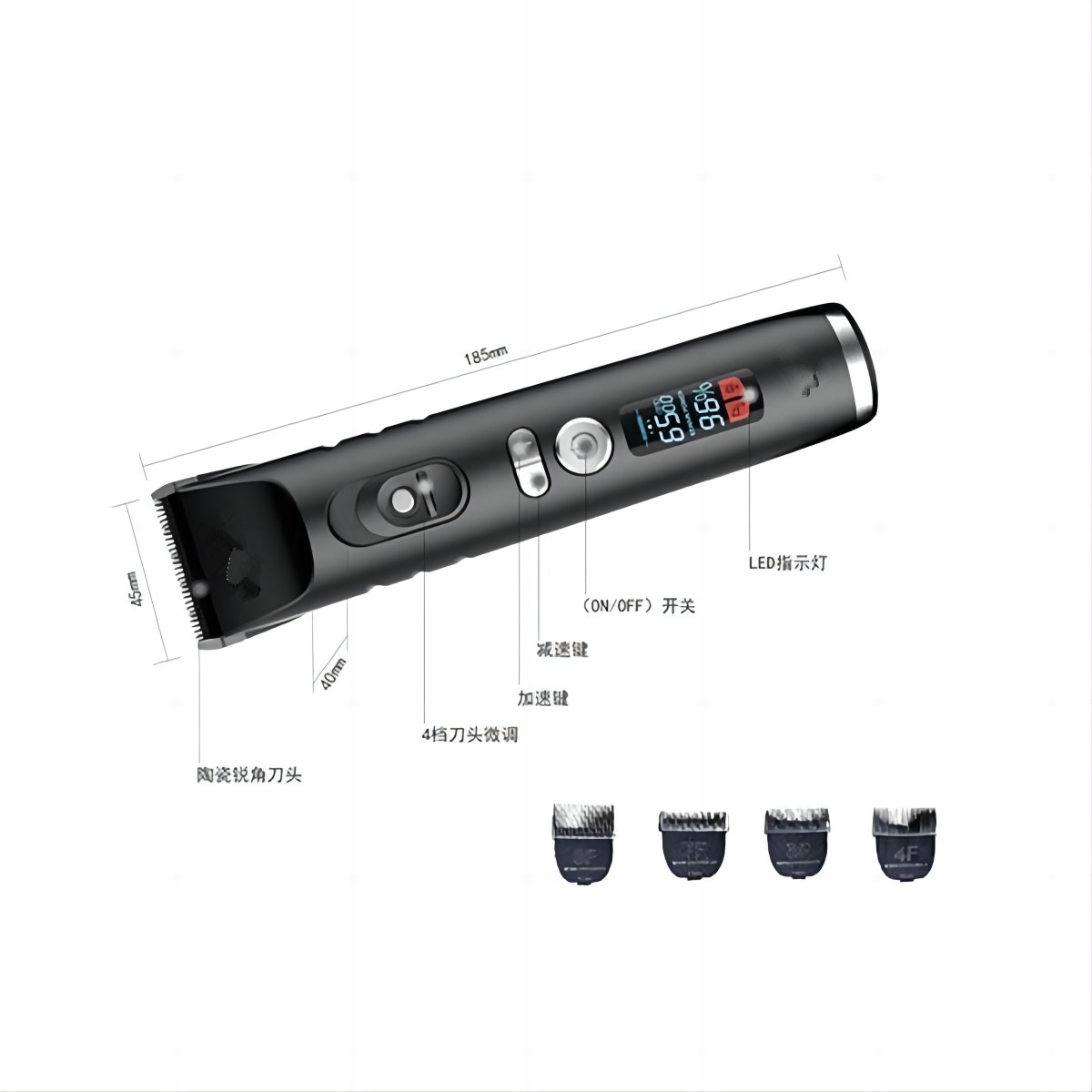 • हाय-डेफिनिशन LED स्क्रीन रिअल-टाइममध्ये बॅटरीची पातळी दाखवते, ग्रूमिंग दरम्यान पॉवर व्यत्यय टाळते आणि घरातील नितळ ग्रूमिंग किंवा सलून सेवा सुनिश्चित करते.